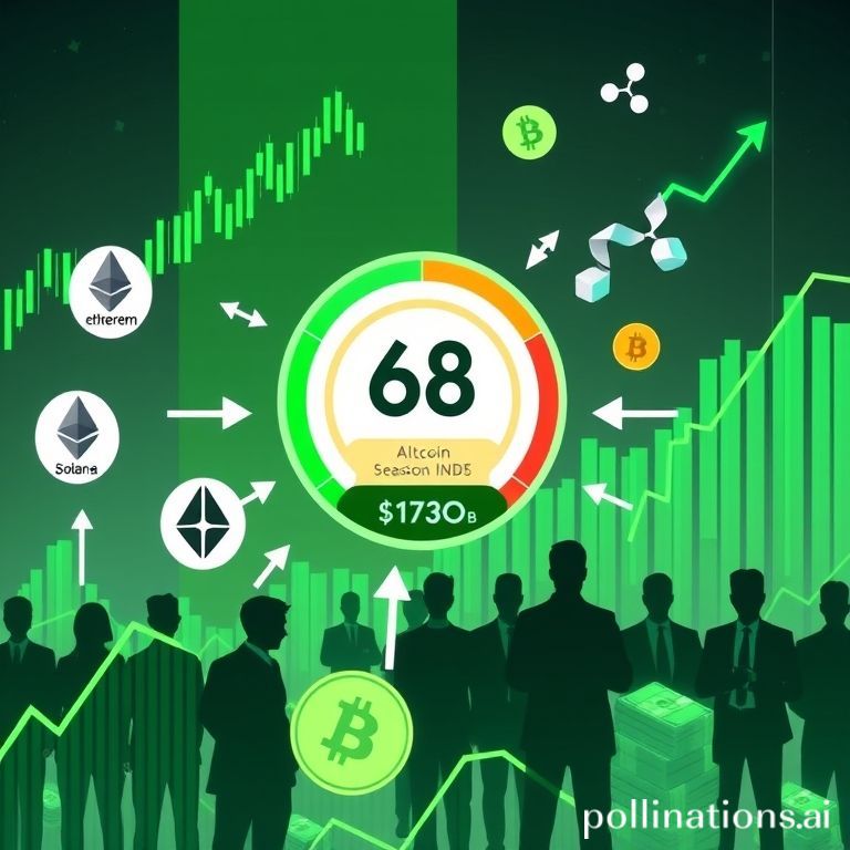 {"prompt":"News-style digital illustration of a bullish crypto market: green candlestick charts, an Altcoin Season Index gauge showing 68, logos of Ethereum, Solana, Ripple and Bitcoin, arrows and streams of money indicating $130 billion inflow, silhouettes of institutional investors in the background, modern high-contrast composition","originalPrompt":"News-style digital illustration of a bullish crypto market: green candlestick charts, an Altcoin Season Index gauge showing 68, logos of Ethereum, Solana, Ripple and Bitcoin, arrows and streams of money indicating $130 billion inflow, silhouettes of institutional investors in the background, modern high-contrast composition","width":768,"height":768,"seed":42,"model":"flux","enhance":false,"nologo":false,"negative_prompt":"undefined","nofeed":false,"safe":false,"quality":"medium","image":[],"transparent":false,"isMature":false,"isChild":false}