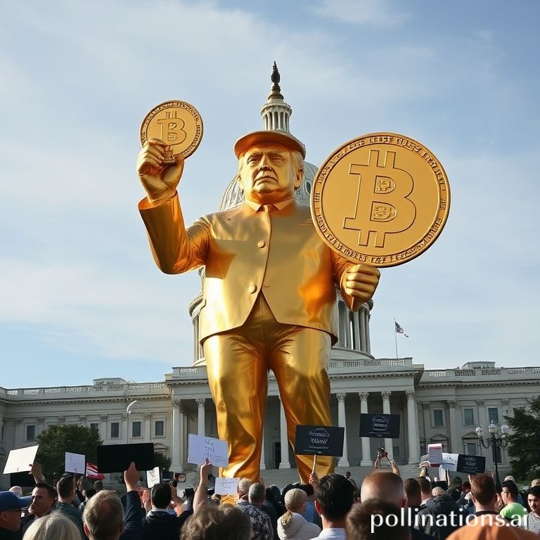 U Washingtonu se pojavila 12‑ft (oko 3,7 m) zlatna statua Donalda Trumpa koja drži Bitcoin ispred Capitola upravo na dan kad je Fed smanjio kamatne stope. Instalaciju je financirala grupa povezana s memecoinom DJTGST (koji je nakratko skočio na tržišnu vrijednost od oko 2,4 milijuna USD). Organizatori kažu da je rad zamišljen kao most između „moderne politike i financijske inovacije“ i simbolična zahvala Trumpu, kako je izjavio predstavnik projekta Hichem Zaghdoudi.